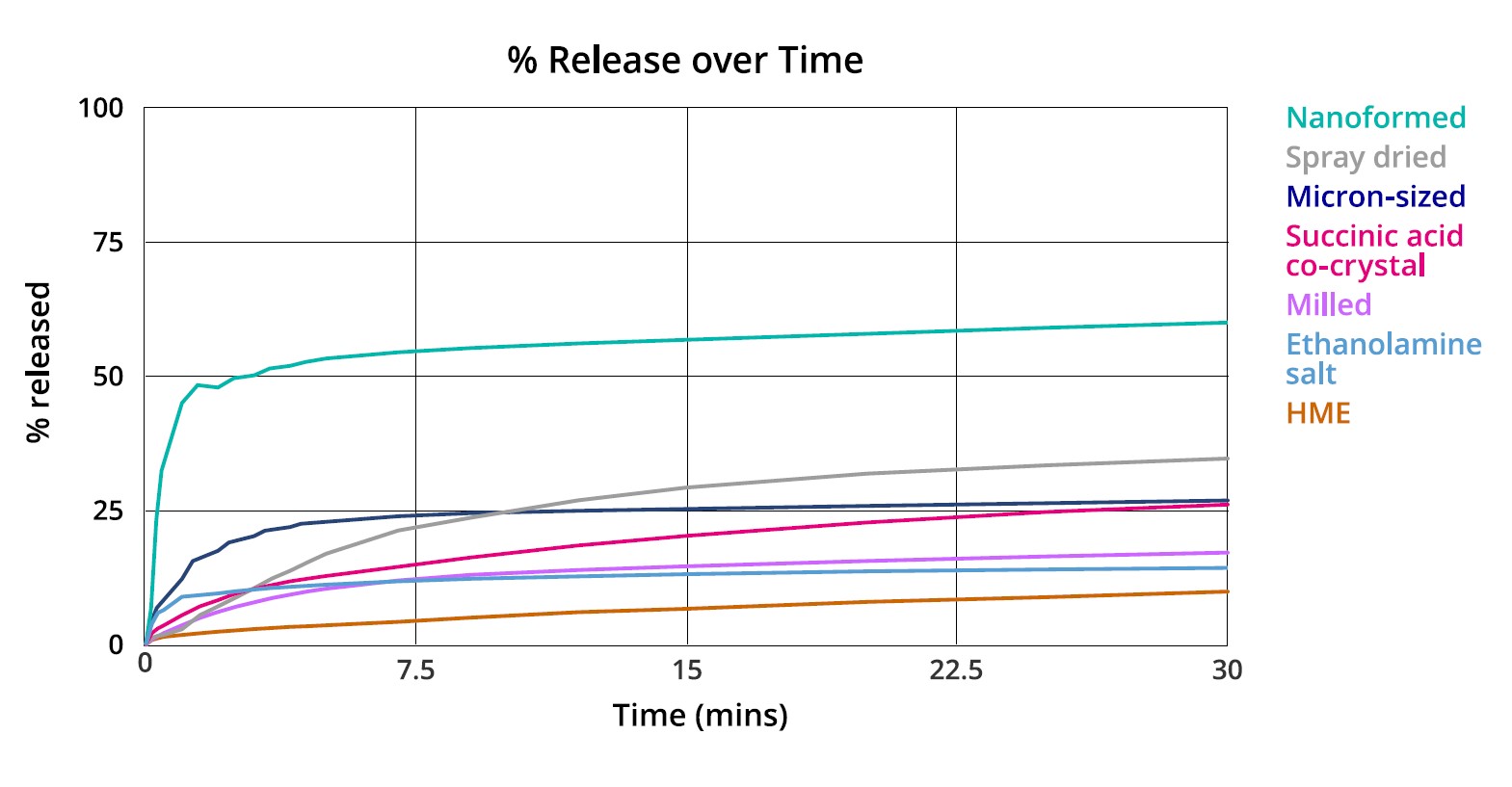 • Results indicate nanoformed particles have remarkably improved dissolution performance relative to all other approaches tested