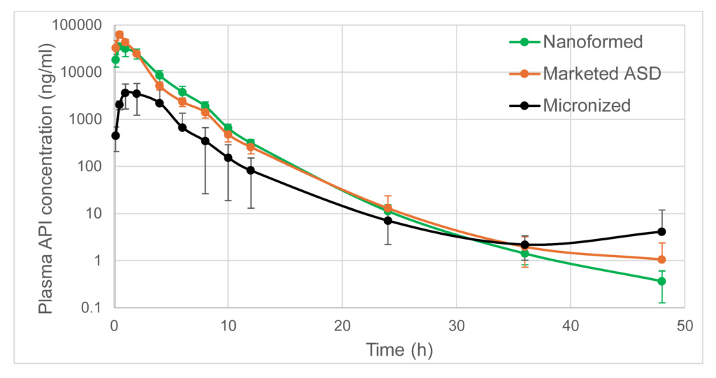 As the exposure pharmacokinetic parameters above show, the nanoformed API has statistically equivalent exposure to the marketed ASD and a seven-fold improvement over the micronized API dosed in the same vehicle, enabling dosing regimens of lower pill burden that are more patient centric, and potentially improving adherence.
