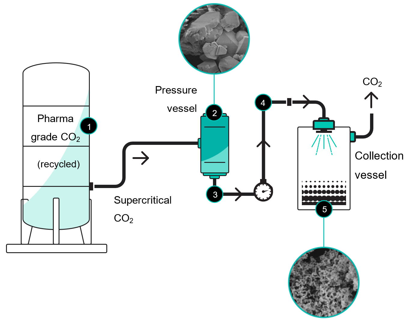 - API is loaded, CO2 is introduced, with pressure and temperature increased to create supercritical state (scCO2), which dissolves the API