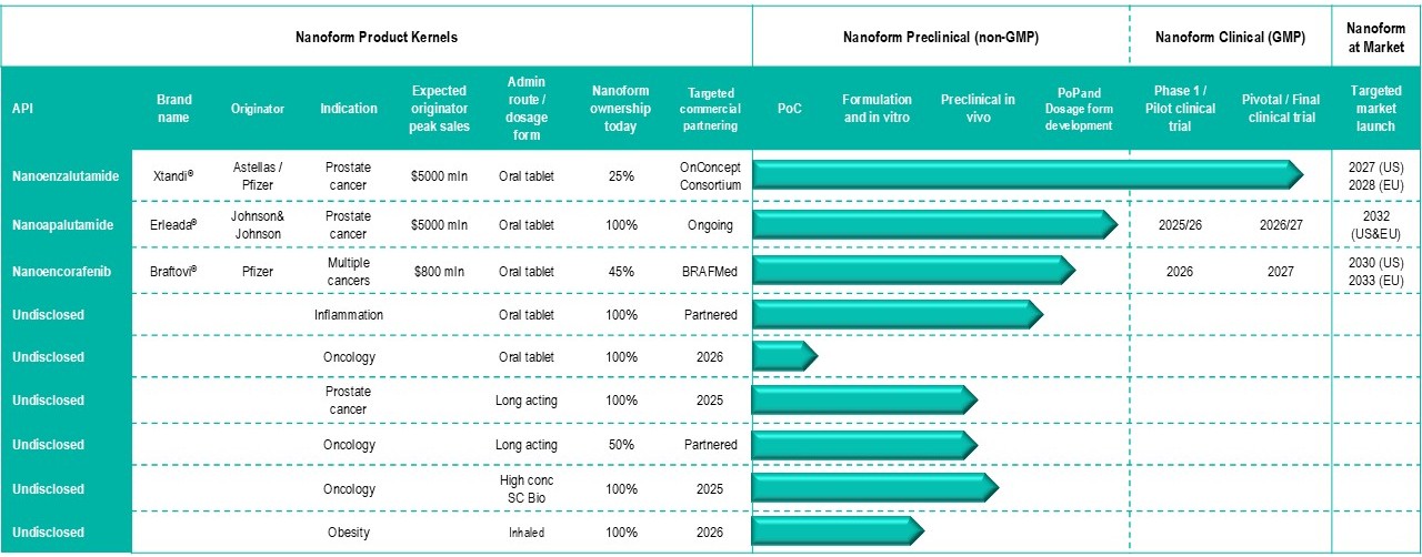Our lead product, Nanoenzalutamide, a co-development with the On-Concept® Consortium is a patient-centric version of XTANDI® (enzalutamide), the number one prescribed androgen receptor inhibitor approved to treat prostate cancer. Planned for launch in the US and EU in 2027–2028, our nano-enhanced formulation is designed to offer a dramatically reduced pill burden for cancer patients, many of whom struggle to swallow large tablets and manage complex, multi-pill regimens. XTANDI® generated $5.3 billion in 2024; partnerships are now being finalised to enable the global launch of this product.